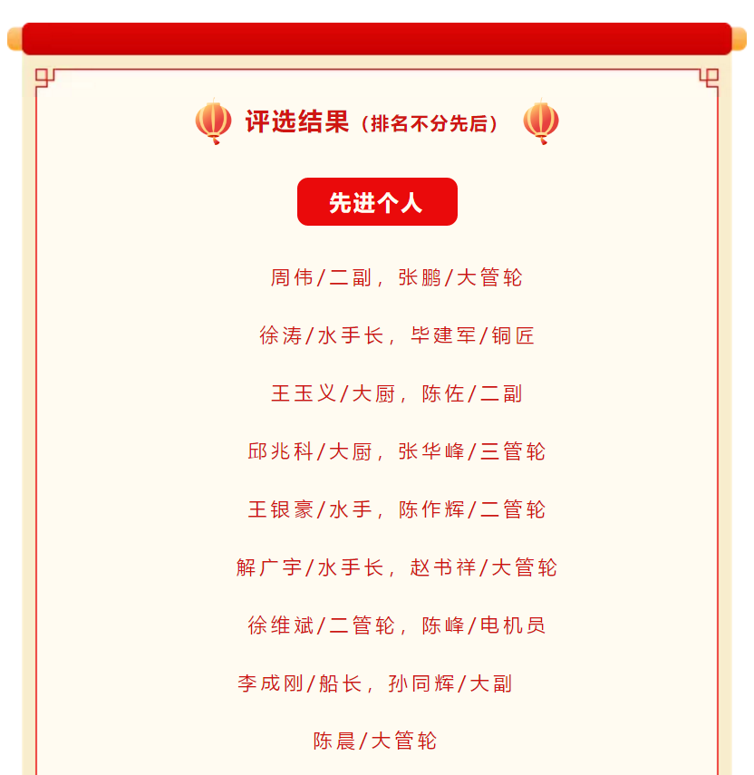 艱辛的一年就要過去了,為表彰先進(jìn),樹立典型,弘揚(yáng)進(jìn)取精神,充分調(diào)動(dòng)廣大船員的積極性、主動(dòng)性和創(chuàng)新性,進(jìn)一步激勵(lì)工作在一線船員的工作熱情,形成“船船爭(zhēng)先進(jìn)、人人比貢獻(xiàn)”的良好氛圍。經(jīng)研究決定,對(duì)本年度內(nèi)公司所有派員船舶及所派船員進(jìn)行評(píng)比考核,結(jié)合船東對(duì)各輪的考核,評(píng)選出新的“先進(jìn)船舶”、“先進(jìn)個(gè)人”及“總經(jīng)理特別獎(jiǎng)”,并給予一定的物質(zhì)獎(jiǎng)勵(lì)。